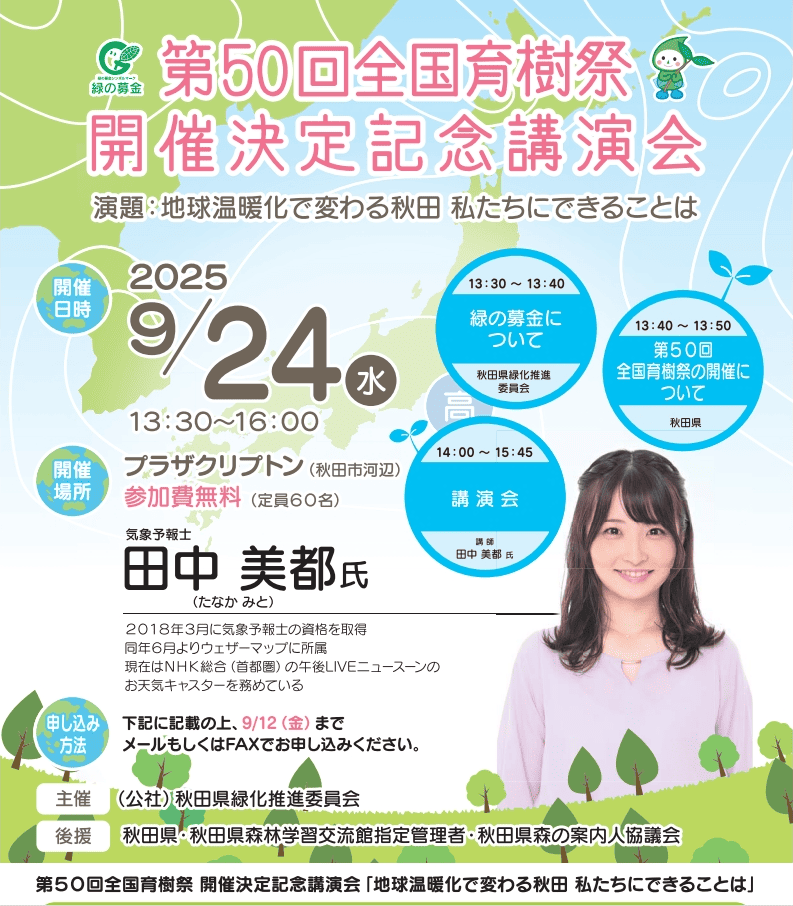 第50回全国育樹祭の開催決定に伴い、県民に森林の働きや大切さを知ってもらうため、気象予報士の田中美都氏を講師として招き、気候変動に対する森林等の役割に関する講演会を実施するとともに、全国育樹祭のPRと参加・参画への周知を行いました。