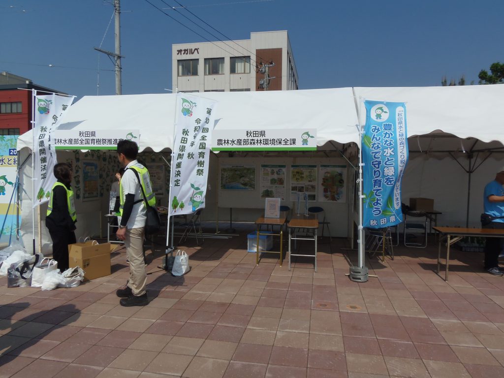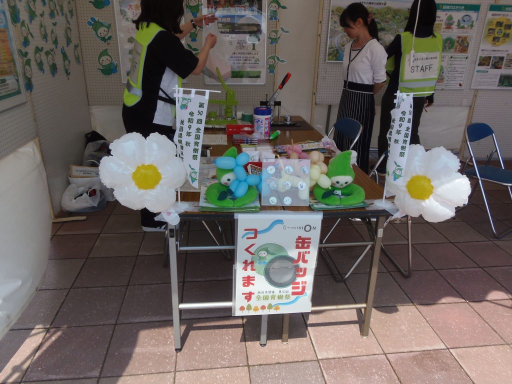 県民に「水と緑の条例」及び「水と緑の森づくり税」並びに「緑の募金」の普及啓発を図り、県民参加の森づくりを推進することを目的に開催された、2025あきた水と緑の森林祭にて全国育樹祭推進室ブースを設置しました。記念バッジの配布等を行い、令和9年開催に向けた県民へのPR活動を行いました。