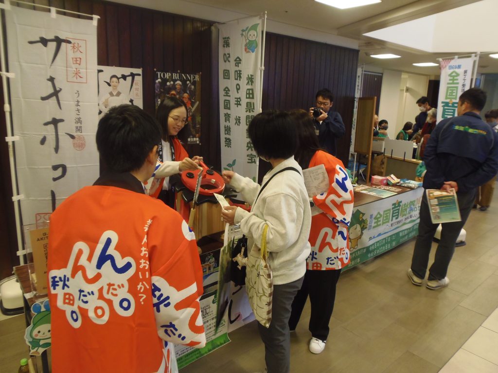 ギャラリー ホーム ギャラリー 2025国民参加の森林づくりシンポジウム 開催日令和7年11月29日(土)開催地和歌山県民文化会館 令和8年の全国育樹祭開催県である和歌山県で行われた【2025国民参加の森林づくりシンポジウム】にて秋田県ブースを設置し、第50回全国育樹祭のPR活動を行いました。